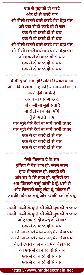 Lyrics of Ek Se Mujhko Do Karde Aur - एक से मुझको दो करदे और