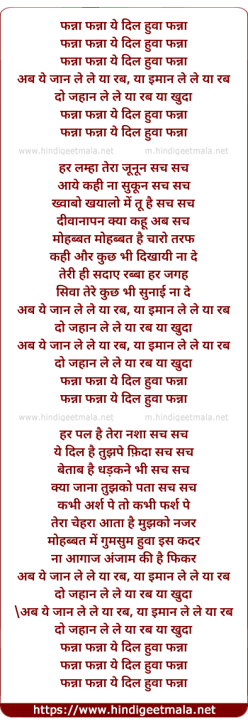 Lyrics of Fanah Fanah Yeh Dil Huwa Fanah (Remix) - फन्ना फन्ना ये दिल हुवा फन्ना