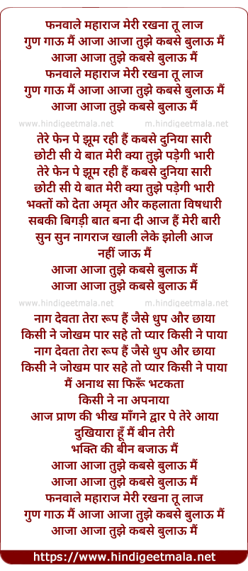 Lyrics of Fanwale Maharaj Meri Rakhnaa Tu Laaj - फनवाले महाराज मेरी रखना तू लाज
