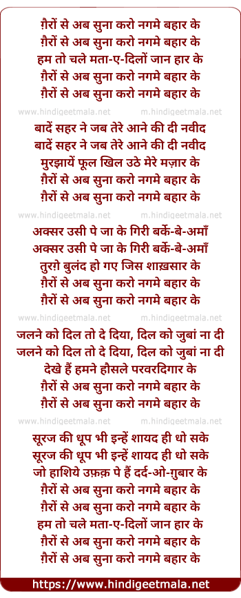 Lyrics of Gairon Se Ab Sunaa Karo Nagmen Bahaar Ke - ग़ैरों से अब सुना करो नगमे बहार के