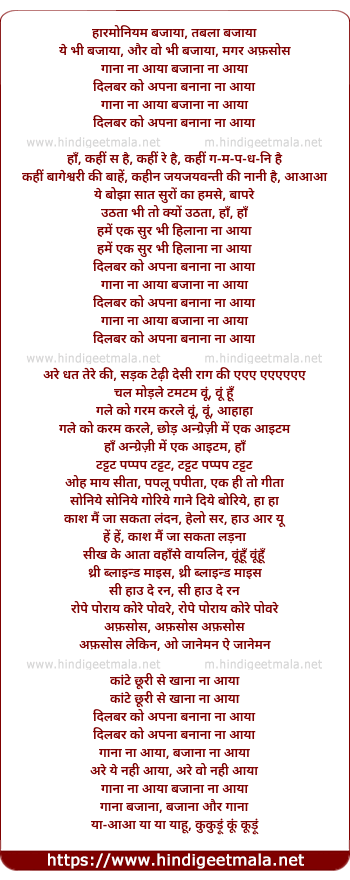 Lyrics of Gana Na Aaya Bajana Na Aaya, Dilbar Ko Apna Banana Na Aaya - गाना ना आया बजाना ना आया, दिलबर को अपना बनाना ना आया