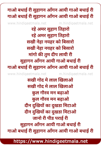 Lyrics of Gao Badhai Ri Suhagan Aangan Aayi - गाओ बधाई री सुहागन आँगन आयी