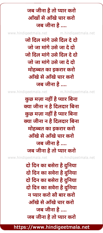 Lyrics of jab Jeena Hai To Pyaar Karo - जब जीना है तो प्यार करो