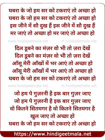 Lyrics of Ghabaraa Ke Jo Ham Sar Ko Takaraaen To Achchhaa Ho - घबरा के जो हम सर को टकराएं तो अच्छा हो
