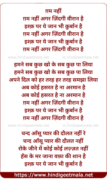 Lyrics of Gham Nahi Gar Zindagi Veeran Hai, Ishq Par Ye Jaan Bhi Qurbaan Hai - ग़म नहीं गर जिन्दगी वीरान है, इश्क पर ये जान भी कुरबान है