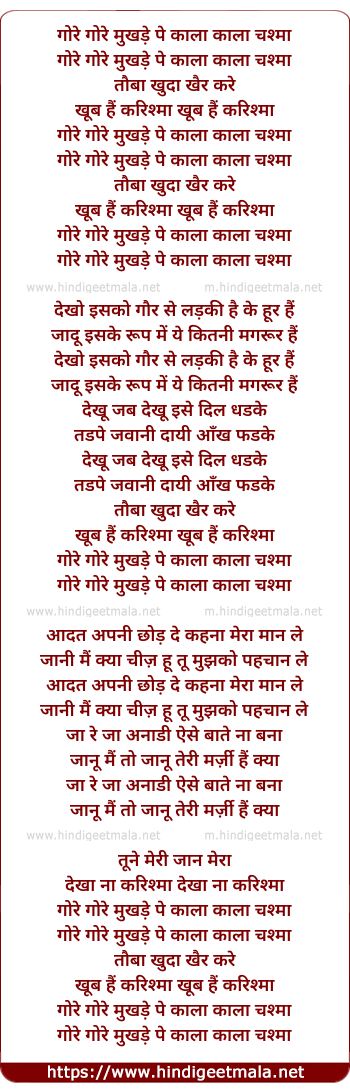 Lyrics of Gore Gore Mukhde Pe Kala Kala Chasma - गोरे गोरे मुखड़े पे काला काला चश्मा