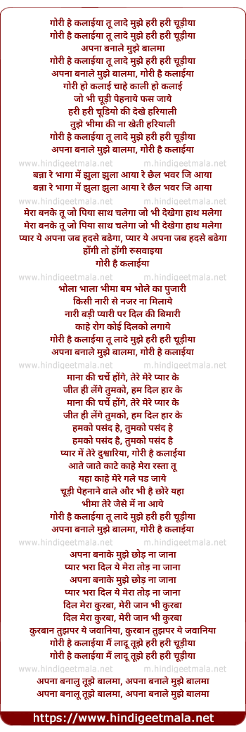 Lyrics of Gori Hai Kalaayiya, Tu Laade Mujhe Hari Hari Chudiya - गोरी है कलाईयाँ तू लादे मुझे हरी हरी चूड़ियाँ