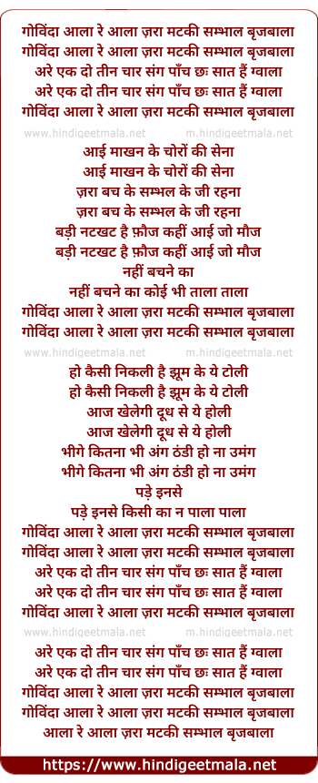 Lyrics of Govinda Aala Re Aala Zara Matki Sambhal Brijbala - गोविंदा आला रे आला ज़रा मटकी सम्भाल बृजबाला