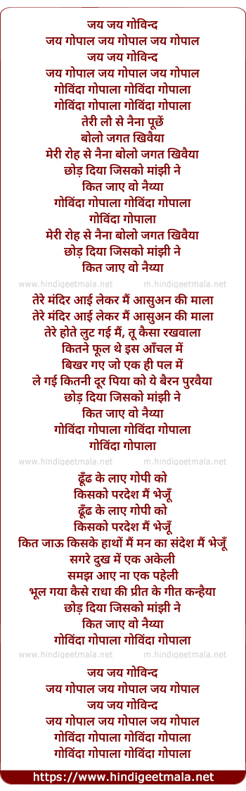 Lyrics of Govinda Gopala Mere Rote Naina Pooche - गोविंदा गोपाल मेरे रोते नैना पूछे