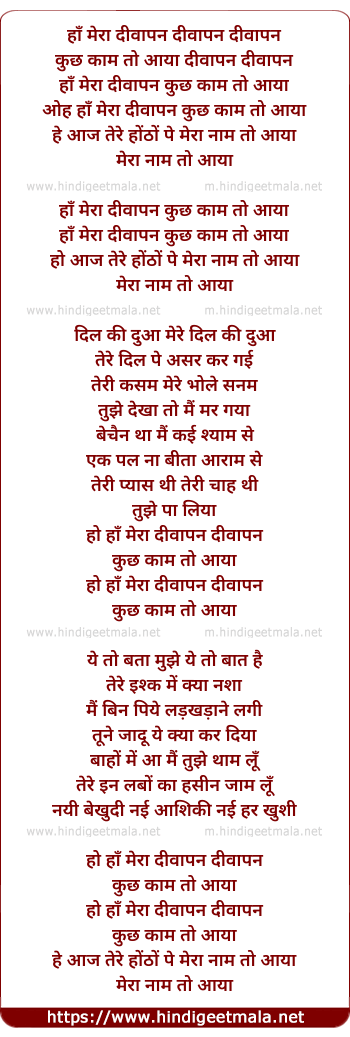 Lyrics of Ha Mera Diwanapan (2) - हाँ मेरा दीवापन