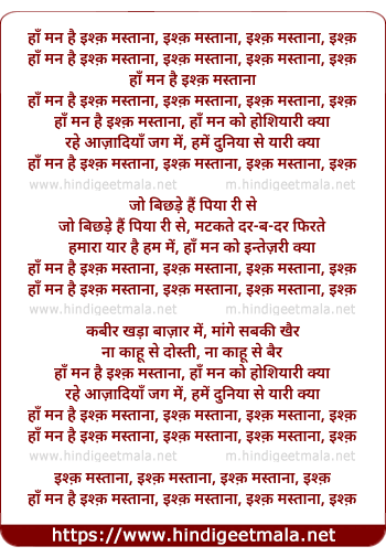 Lyrics of Haa Mann Hai Ishq Mastana - हाँ मन है इश्क़ मस्ताना