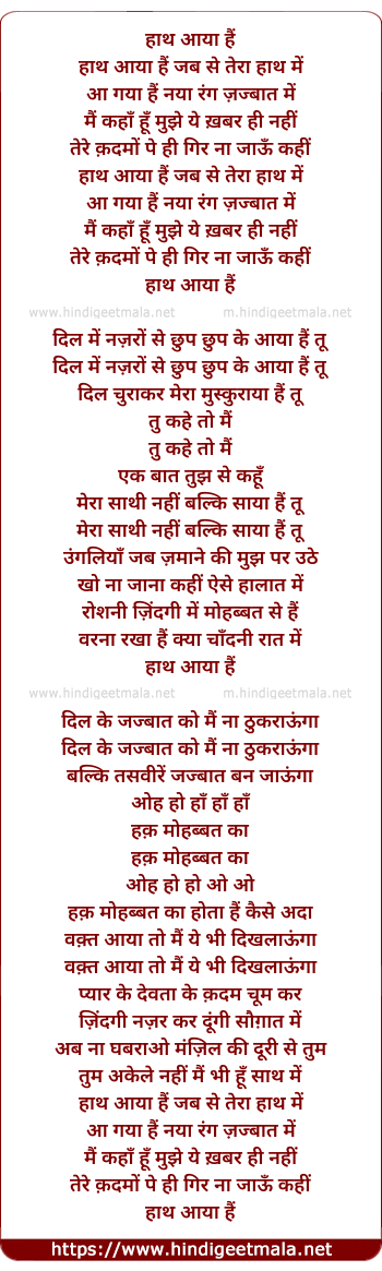 Lyrics of Haath Aayaa Hai Jab Se Teraa Haath Men - हाथ आया है जब से तेर हाथ में