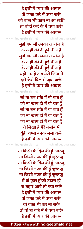 Lyrics of Hai Isi Me Pyar Ki Aabru - है इसी में प्यार की आबरू