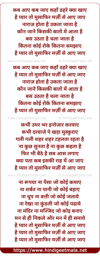 Lyrics of Hai Pyar Toh Musafir - कब आए कब जाए कहाँ ठहरे क्या खाए