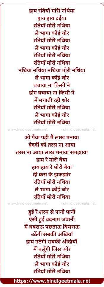 Lyrics of Hai Ratiya Mori Nathiya - हाय रतियाँ मोरी नथिया