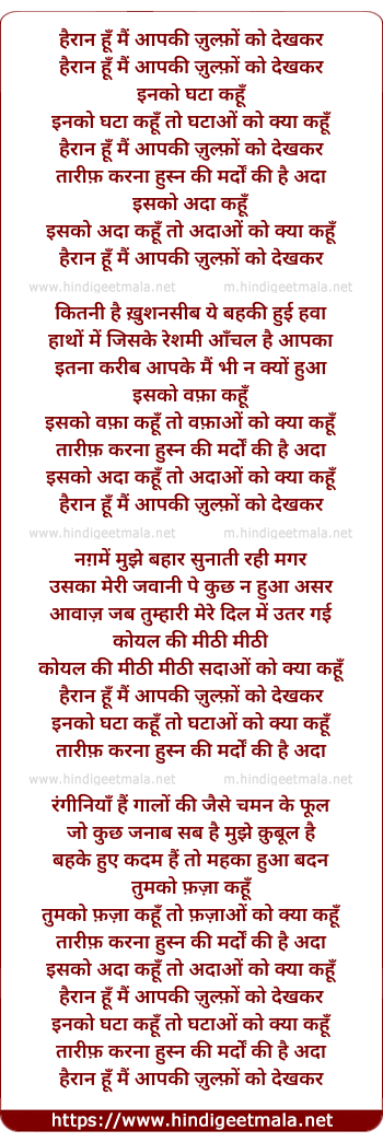 Lyrics of Hairan Hu Main Aapki Julfon Ko Dekhkar - हैरान हूँ मैं आपकी ज़ुल्फ़ों को देखकर
