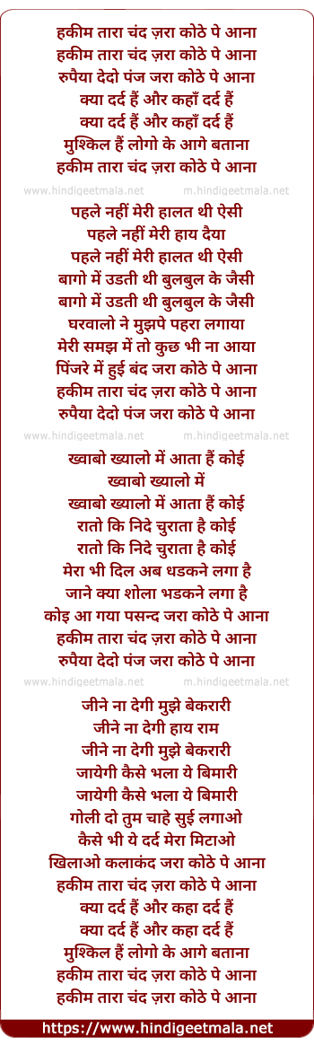 Lyrics of Hakeem Tarachand Zara Kothe Pe Aana - हकीम तारा चंद ज़रा कोठे पे आना