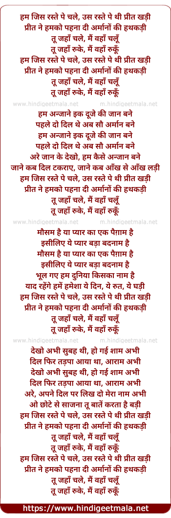 Lyrics of Ham Jis Raste Pe Chale, Us Raste Pe Thi Prit Khadi - हम जिस रस्ते पे चले, उस रस्ते पे थी प्रीत खड़ी