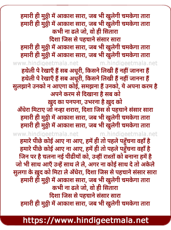 Lyrics of Hamari Hi Mutthi Me Aakash Sara - हमारी ही मुठ्ठी में आकाश सारा