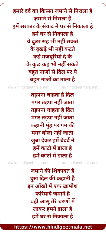 Lyrics of Hamare Dard Ka Kissa Zamane Se Nirala Hai - हमारे दर्द का किस्सा ज़माने से निराला है