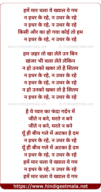 Lyrics of Hame Mar Chala Ye Khayal Ye Gham - हमें मार चला ये ख्याल ये गम