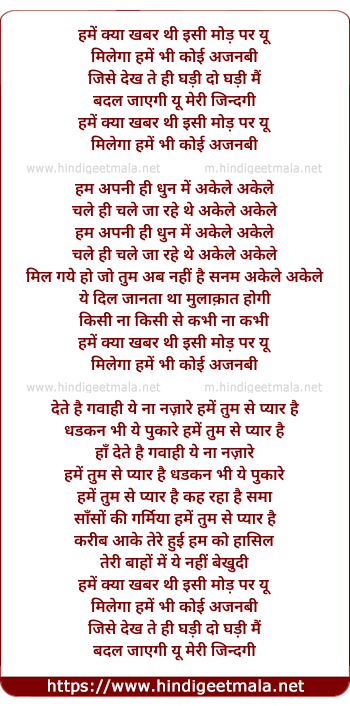 Lyrics of Hamen Kyaa Khabar Thi Isi Mod Par Yun - हमें क्या खबर थी इसी मोड़ पर यूँ