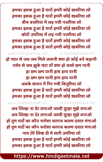 Lyrics of Hamka Isak Huwa Hai Yaro - हमका इश्क हुआ है यारों