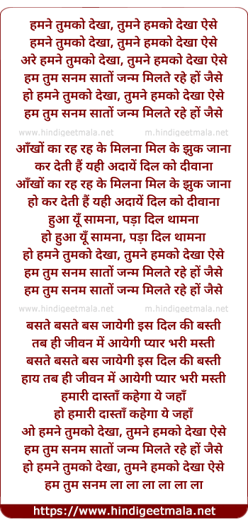 Lyrics of Hamne Tumko Dekha - हमने तुमको देखा