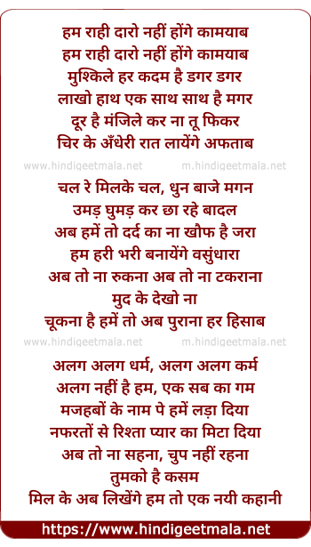 Lyrics of Ham rahi Daro Nahi Honge Kamayab - हम राही दारो नहीं होंगे कामयाब