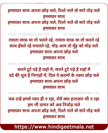 Lyrics of Hamsafar Sath Apna Chhod Chale - हमसफ़र साथ अपना छोड़ चले