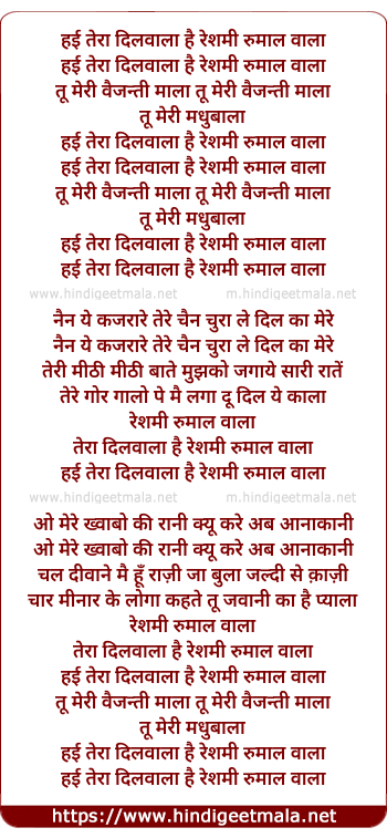 Lyrics of Haii Teraa Dilavaalaa Hai Reshami Rumaal Vaalaa - हई तेरा दिलवाला है रेशमी रुमाल वाला