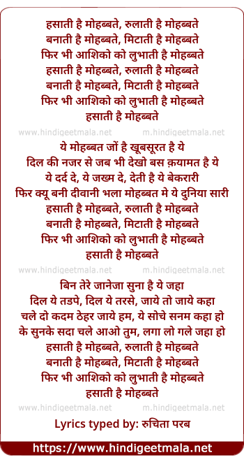 Lyrics of Hansati Hai Mohabbate Rulati Hai Mohabbate - हसाती है मोहब्बते रुलाती है मोहब्बते