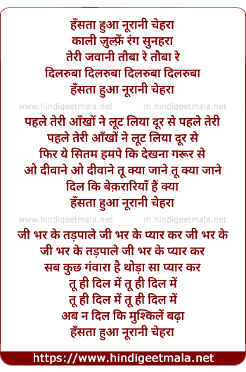 Lyrics of Hansta Hua Nurani Chehra, Kali Zulfe Rang Sunhera - हँसता हुआ नूरानी चेहरा, काली जुल्फे रंग सुन्हेरा
