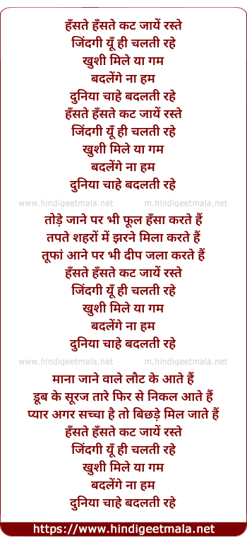 Lyrics of Hanste Hanste Kat Jaye Raste (Female) - हँसते हँसते कट जायें रस्ते