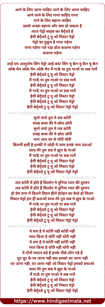 Lyrics of Happy Birthday To You O Mr Pedro - हैपी बेर्द्थडे टू यू ओ मिस्टर पेड्रो