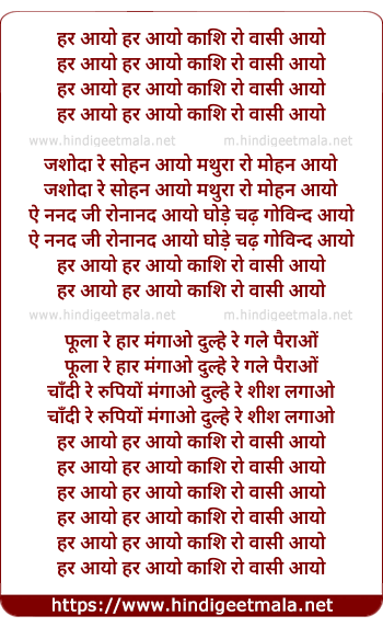 Lyrics of Har Aayo Kaashi Ro Waasi Aayo - हर आयो काशि रो वासी आयो
