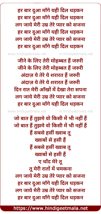 Lyrics of Har Baar Dua Mange - हर बार दुआ माँगे यही दिल धड़कन