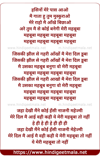 Film CastRajesh Khanna, Hema Malini, Prem Chopra, Asha Sachdev, Meena T, Asrani, Manmohan Krishna, Sujit Kumar, Yogita Bali, Harindranath Chattopadhyay, Chandra Shekhar, Nasir Husain, Leela Mishra, Madan Puri, Master Alankar, Alankar, Birbal, Raj Rani, Uma DuttSingerKishore Kumar, Lata Mangeshkar, Manna DeyLyricistAnand BakshiMusic ByR D Burman, Basu Chakraborty, Maruti Rao, Basu ManohariDirectorShakti SamantaProducerAshok, Heera, Ibrahim, Mushir RiazExternal LinksMehbooba at IMDB Mehbooba at Wikipedia