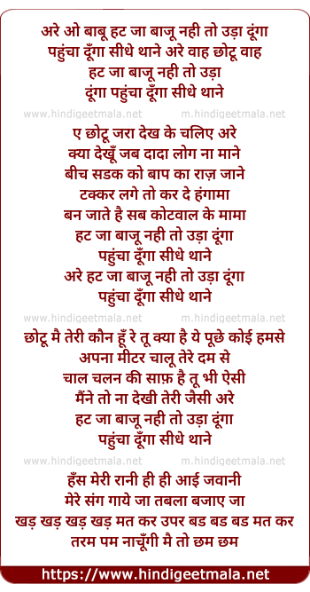 Lyrics of Hat Ja Bajoo Nahi To Uda Dunga, Pahucha Dunga - हट जा बाजू नही तो उड़ा दूंगा, पहुंचा दूँगा