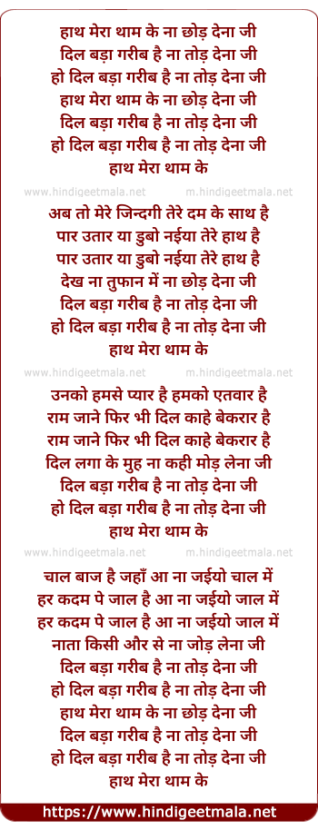 Lyrics of Hath Mera Tham Ke Naa Chhod Dena Ji - हाथ मेरा थाम के ना छोड़ देना जी