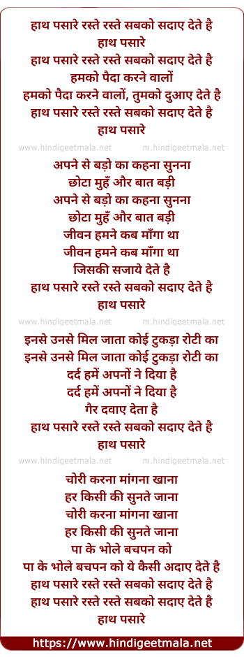 Lyrics of Hath Pasare Raste Raste Sabko Sadaaye Dete Hai - हाथ पसारे रस्ते रस्ते सबको सदाए देते है