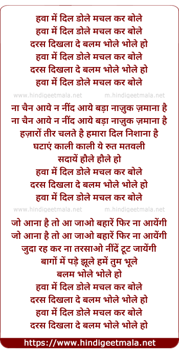 Lyrics of Hava Me Dil Dole Machal Kar Bole - हवा में दिल डोले मचल कर बोले