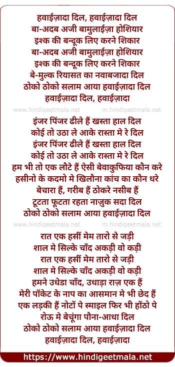 Lyrics of Hawaizada Dil - हवाईज़ादा दिल