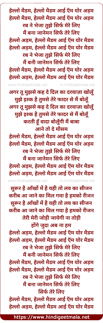 Lyrics of Hello Madam Hello Madam I Am You Adam - हेल्लो मैडम हेल्लो मैडम आई ऍम योर अड़म