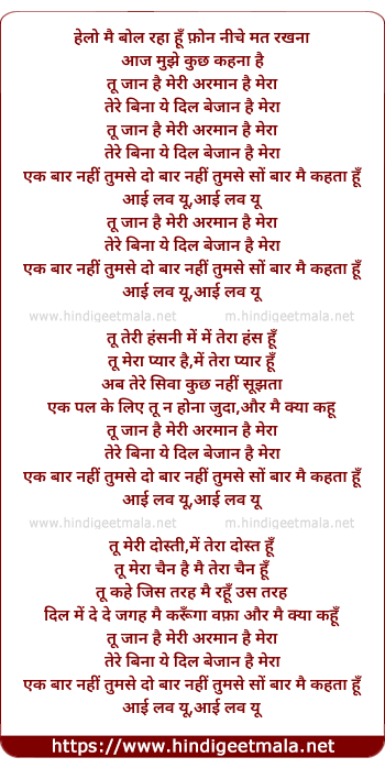 Lyrics of Hello! Tu Jaan Hai Meri - हेलो !तू जान है मेरी