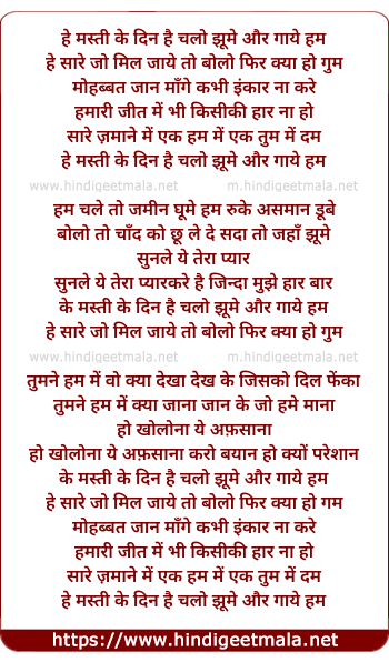 Lyrics of Hey Masti Ke Din Hain - हे मस्ती के दिन है चलो झूमे और गाये हम