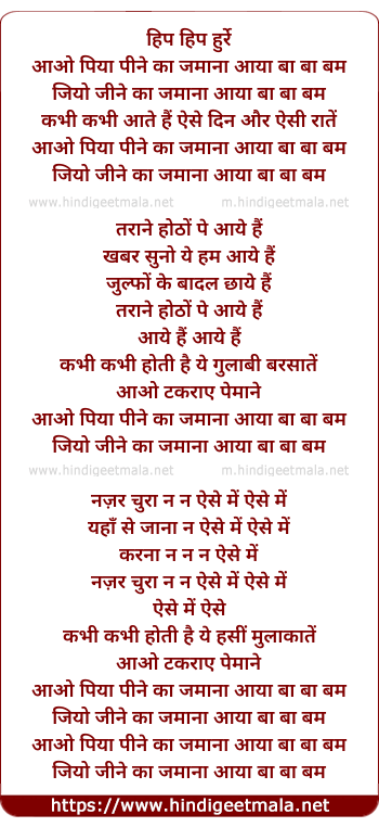 Lyrics of Hip Hip, Aao Piyo Peene Ka Zamana Aaya - हिप हिप, आओ पिया पीने का जमाना आया