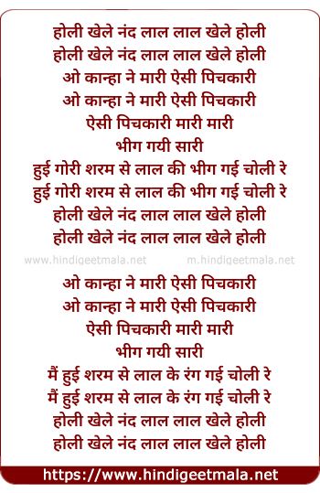 Lyrics of Holi Khelein Nand Laal, Laal Khele Holi Kanha Ne Mari Aise Pichkari - होली खेले नंद लाल, लाल खेले होली कान्हा ने मारी ऐसी पिचकारी