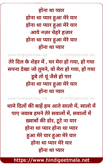 Lyrics of Hona Tha Pyar Hua Mere Yaar - होना था प्यार हुआ मेरे यार