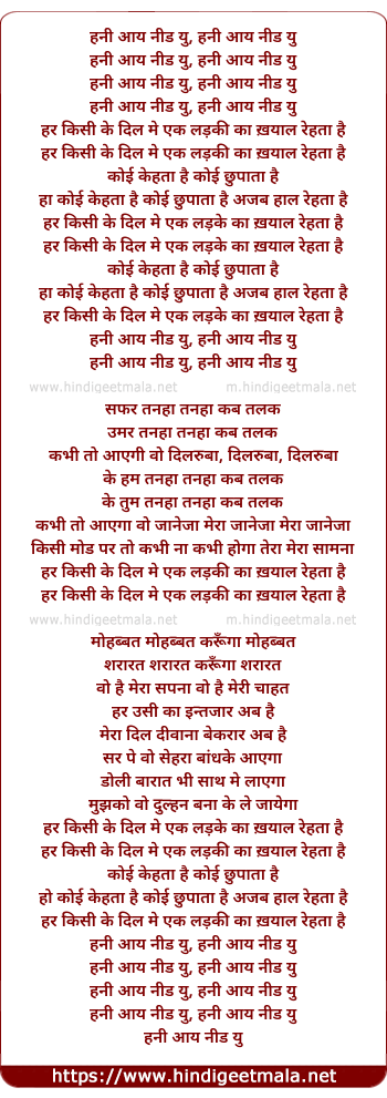 Lyrics of Honey, Har Kisi Ke Dil Me Ik Ladki Ka Khayaal - हर किसी के दिल मे एक लड़की का ख्याल रेहता है